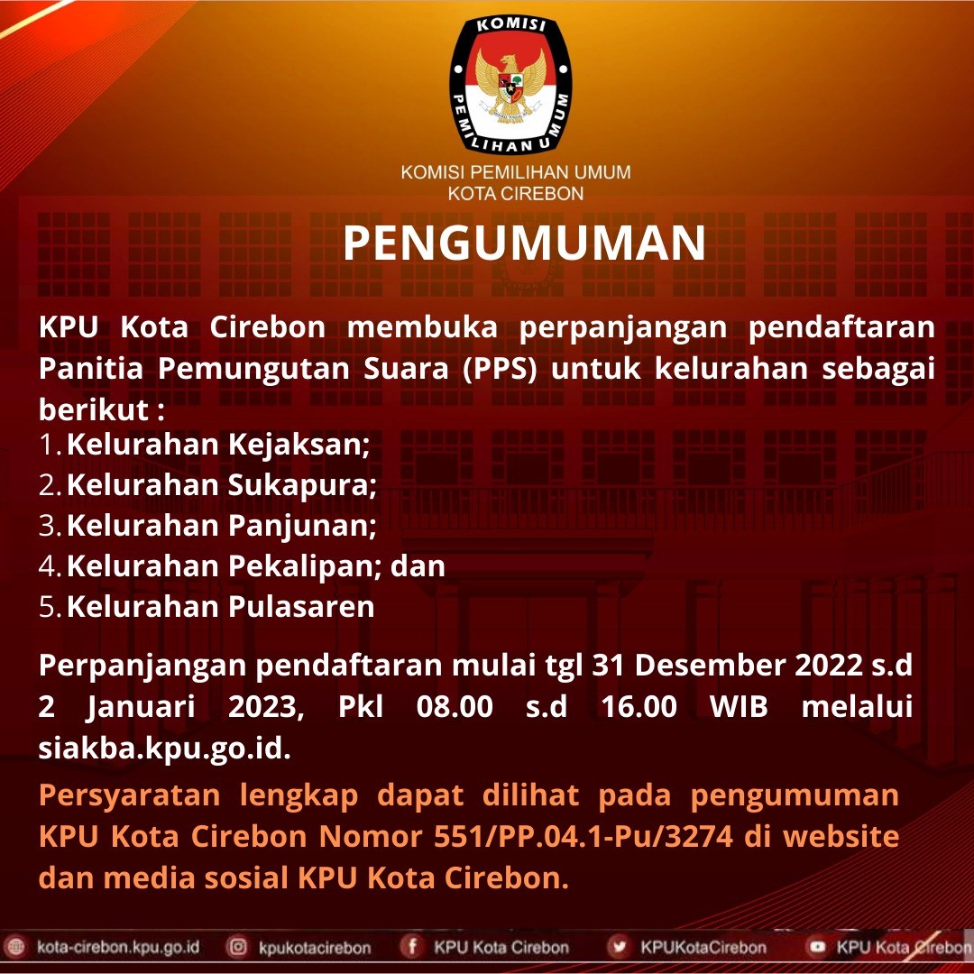 Perpanjangan Pendaftaran Seleksi Calon Anggota Panitia Pemungutan Suara Untuk Pemilihan Umum Serentak Tahun 2024 Sabtu, 31 Desember 2022 07:00 138 Perpanjangan Pendaftaran Seleksi Calon Anggota Panitia Pemungutan Suara Untuk Pemilihan Umum Serentak Tahun 2024 Unduh pengumuman Baca Selengkapnya
