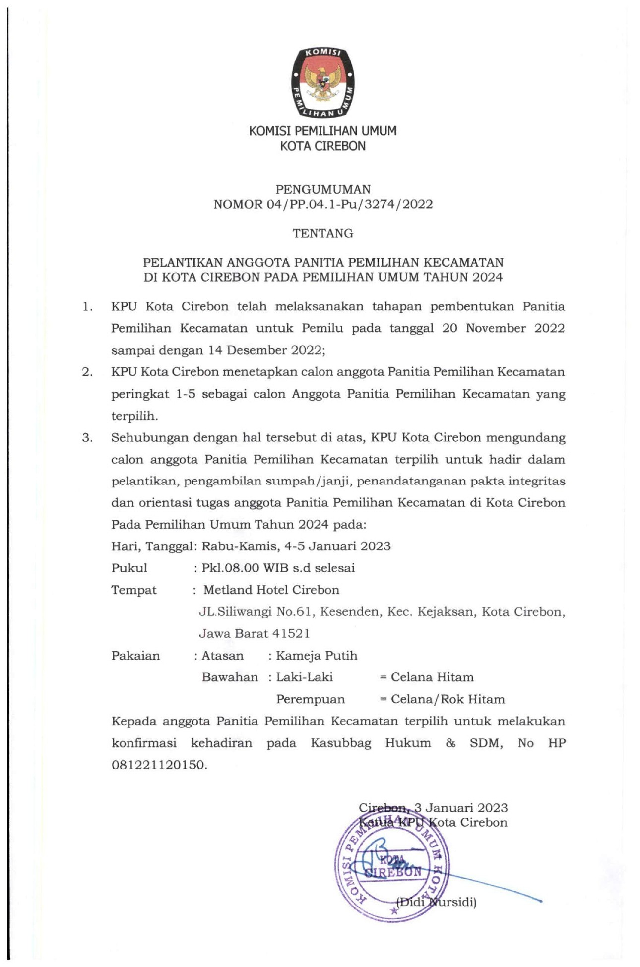 Pelantikan Anggota Panitia Pemilihan Kecamatan di Kota Cirebon Pada Pemilihan Umum Tahun 2024 Selasa, 03 Januari 2023 07:00 181 Pelantikan Anggota Panitia Pemilihan Kecamatan di Kota Cirebon Pada Pemilihan Umum Tahun 2024 Baca Selengkapnya