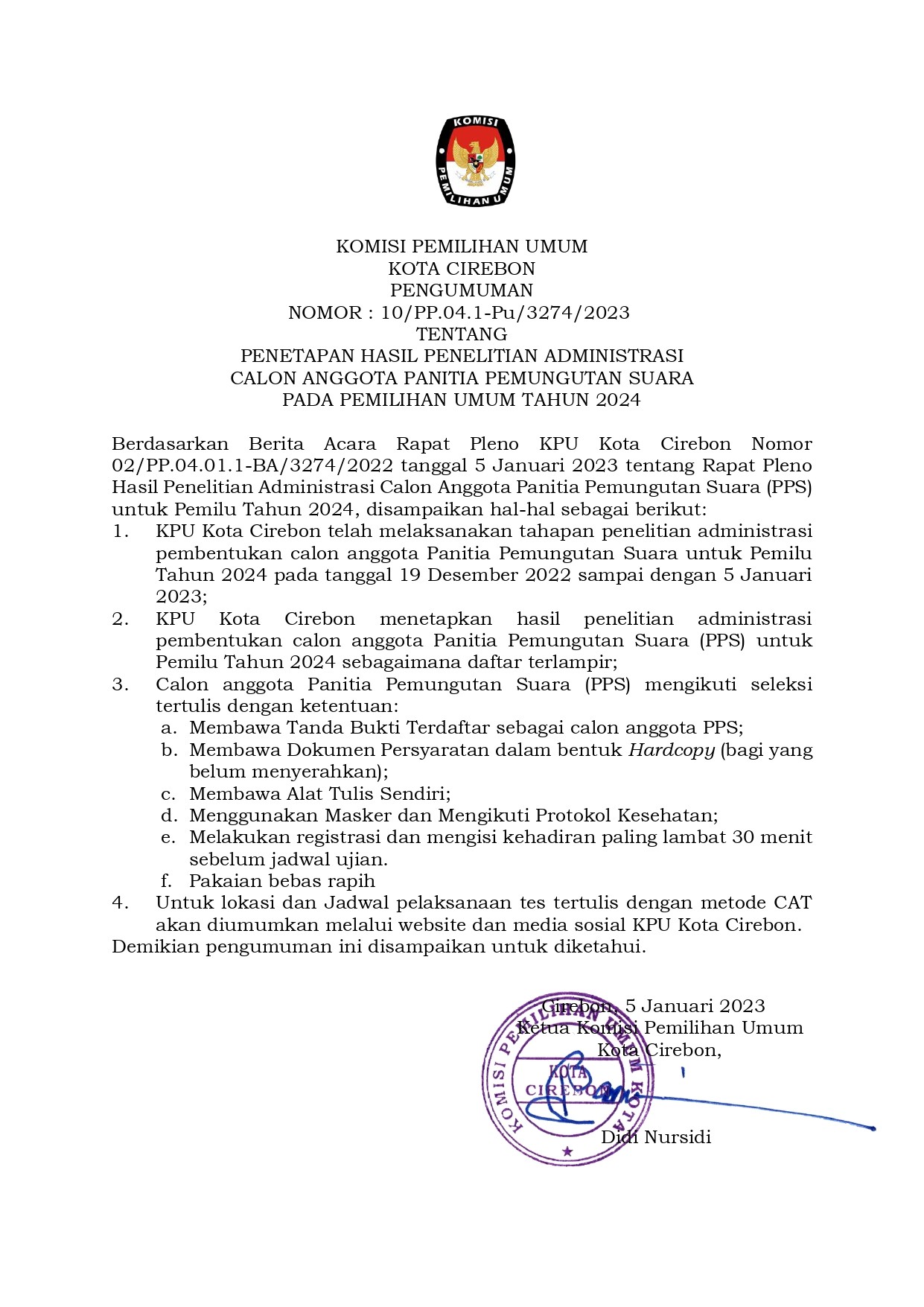 Penetapan Hasil Seleksi Tertulis dan Jadwal Wawancara Panitia Pemungutan Suara Pemilihan Umum Tahun 2024 Minggu, 15 Januari 2023 07:00 472 Penetapan Hasil Seleksi Tertulis dan Jadwal Wawancara Panitia Pemungutan Suara Pemilihan Umum Tahun 2024 Unduh Pengumuman Baca Selengkapnya