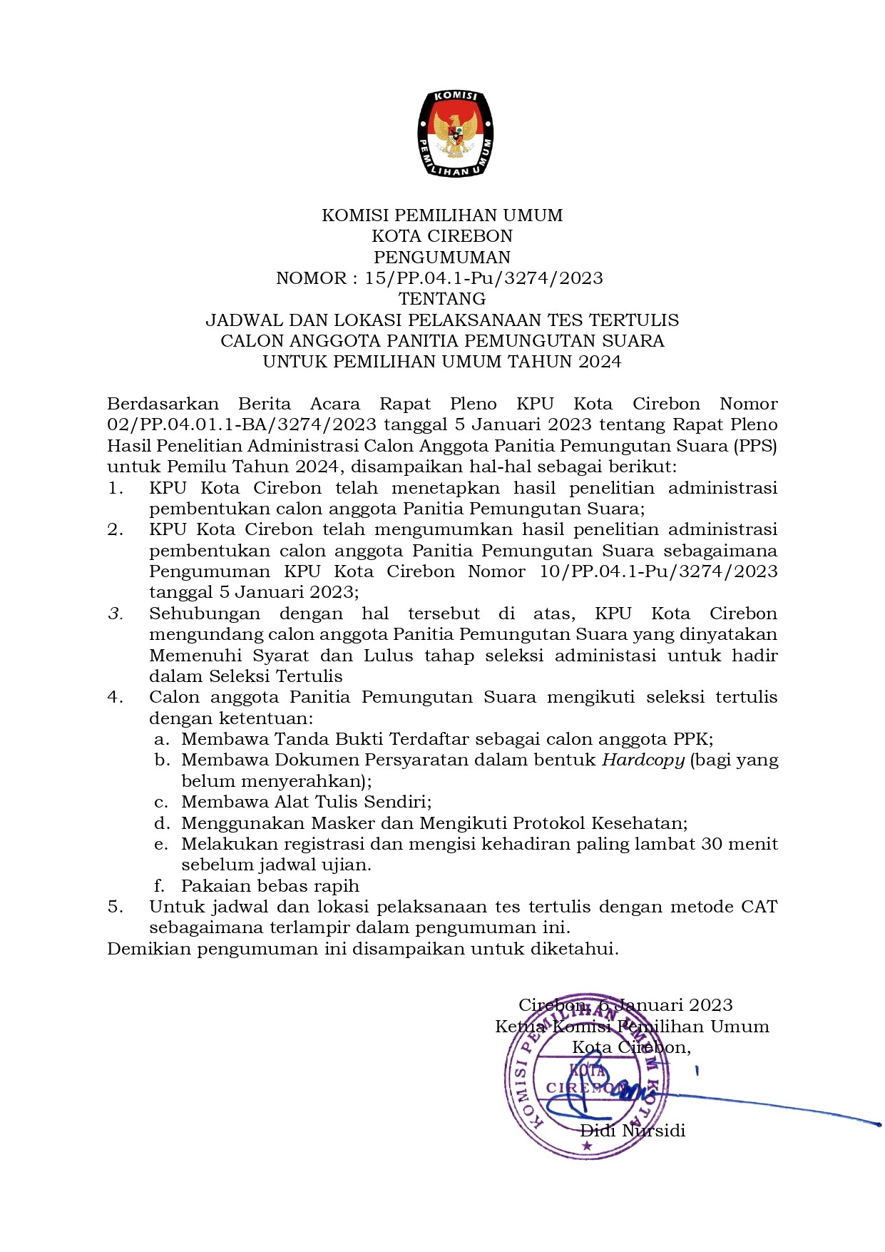 Jadwal dan Lokasi Pelaksanaan Tes Tertulis Calon Anggota PPS Untuk Pemilu Tahun 2024 Jumat, 06 Januari 2023 17:00 354 Unduh Jadwal dan Lokasi Pelaksanaan Tes Tertulis Calon Anggota PPS Untuk Pemilu Tahun 2024 Baca Selengkapnya