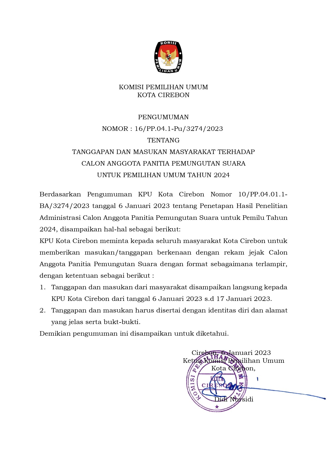 Tanggapan dan Masukan Masyarakat Terhadap Calon Anggota PPS Pemilu Tahun 2024 Jumat, 06 Januari 2023 19:00 430 Unduh Tanggapan dan Masukan Masyarakat Terhadap Calon Anggota PPS Pemilu Tahun 2024 Baca Selengkapnya