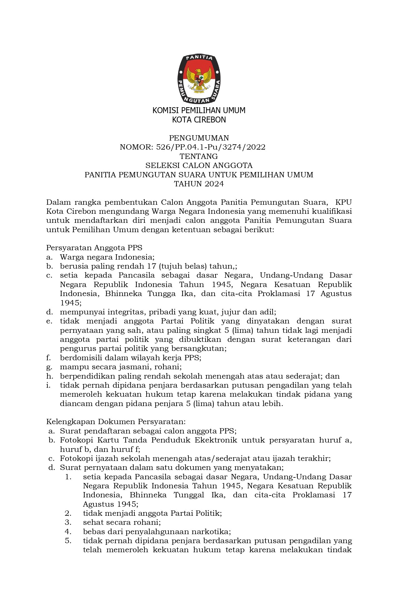 Seleksi Calon Anggota Panitia Pemungutan Suara Untuk Pemilihan Umum Tahun 2024 Minggu, 18 Desember 2022 07:00 386 Seleksi Calon Anggota Panitia Pemungutan Suara Untuk Pemilihan Umum Tahun 2024 Unduh Pengumuman, Format Surat, dan Daftar Riwayat Hidup Baca Selengkapnya