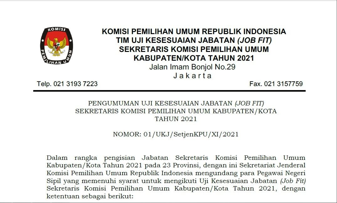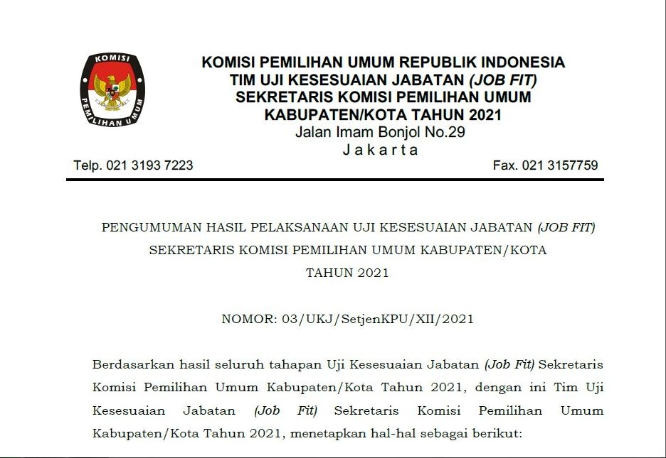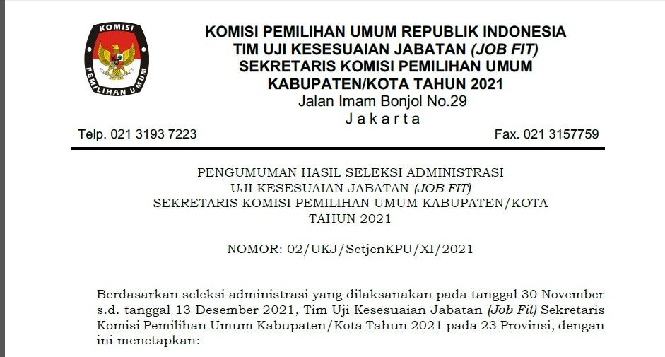Jakarta, kpu.go.id - Pengumuman Hasil Seleksi Administrasi Uji Kesesuaian Jabatan (Job Fit) Sekretaris Komisi Pemilihan Umum Kabupaten/Kota Tahun 2021, Nomor: 02/UKJ/SetjenKPU/XI/2021.Pengumuman Hasil Seleksi Administrasi Uji Kesesuaian Jabatan (Job Fit) Sekretaris Komisi Pemilihan Umum Kabupaten/Kota Tahun 2021, Nomor: 02/UKJ/SetjenKPU/XI/2021.