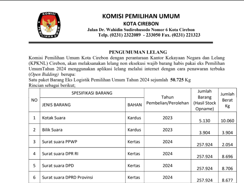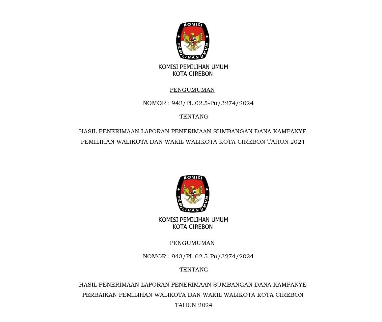 Cirebon, kota-cirebon.kpu.go.id - Sesuai dengan ketentuan pada Peraturan Komisi Pemilihan Umum Nomor 14 Tahun 2024 tentang Dana Kampanye Peserta Pemilihan Gubernur dan Wakil Gubernur, Bupati dan Wakil Bupati, serta Walikota dan Wakil Walikota dan Keputusan Komisi Pemilihan Umum Nomor 1364 Tahun 2024 Tentang Pedoman Teknis Pelaporan Dana Kampanye Peserta Pemilihan Gubernur Dan Wakil Gubernur, Bupati Dan Wakil Bupati, Serta Walikota Dan Wakil Walikota, kami sampaikan Hasil Penerimaan Laporan Penerimaan Sumbangan Dana Kampanye dan Laporan Penerimaan Sumbangan Dana Kampanye Perbaikan Pemilihan Walikota dan Wakil Walikota Cirebon Tahun 2024 yang dapat dilihat pada tautan berikut: LPSDK.