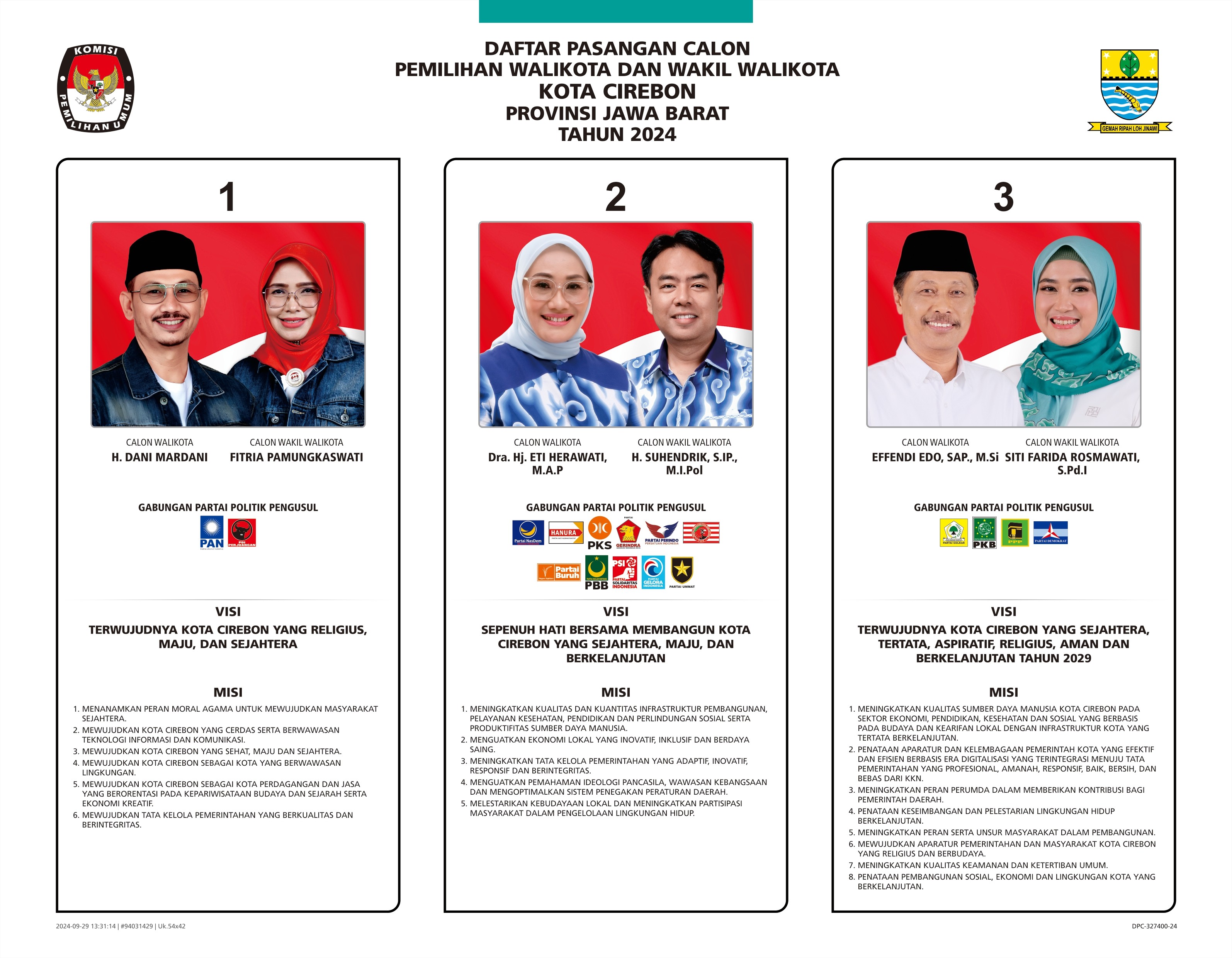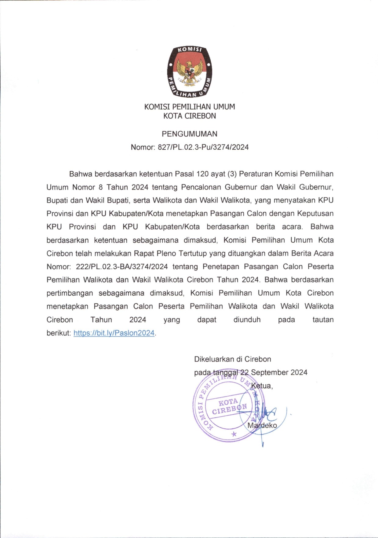 Cirebon, kota-cirebon.kpu.go.id - Berdasarkan Keputusan KPU Nomor 328 Tahun 2024 tentang Pedoman Teknis Pendaftaran Pemantau dan Lembaga Survei atau Jajak Pendapat dan Penghitungan Cepat Hasil Pemilihan Gubernur dan Wakil Gubernur, Bupati dan Wakil Bupati, Serta Walikota dan Wakil Walikota, KPU mengumumkan dan membuka pendaftaran lembaga Survei atau Jajak Pendapat dan Penghitungan Cepat Hasil Pemilu, paling lambat 30 (tiga puluh) hari sebelum hari pemungutan dan akan berakhir pada 28 Oktober 2024. Lembaga survei yang mendaftar pertama kali tercatat pada tanggal 29 September 2024.