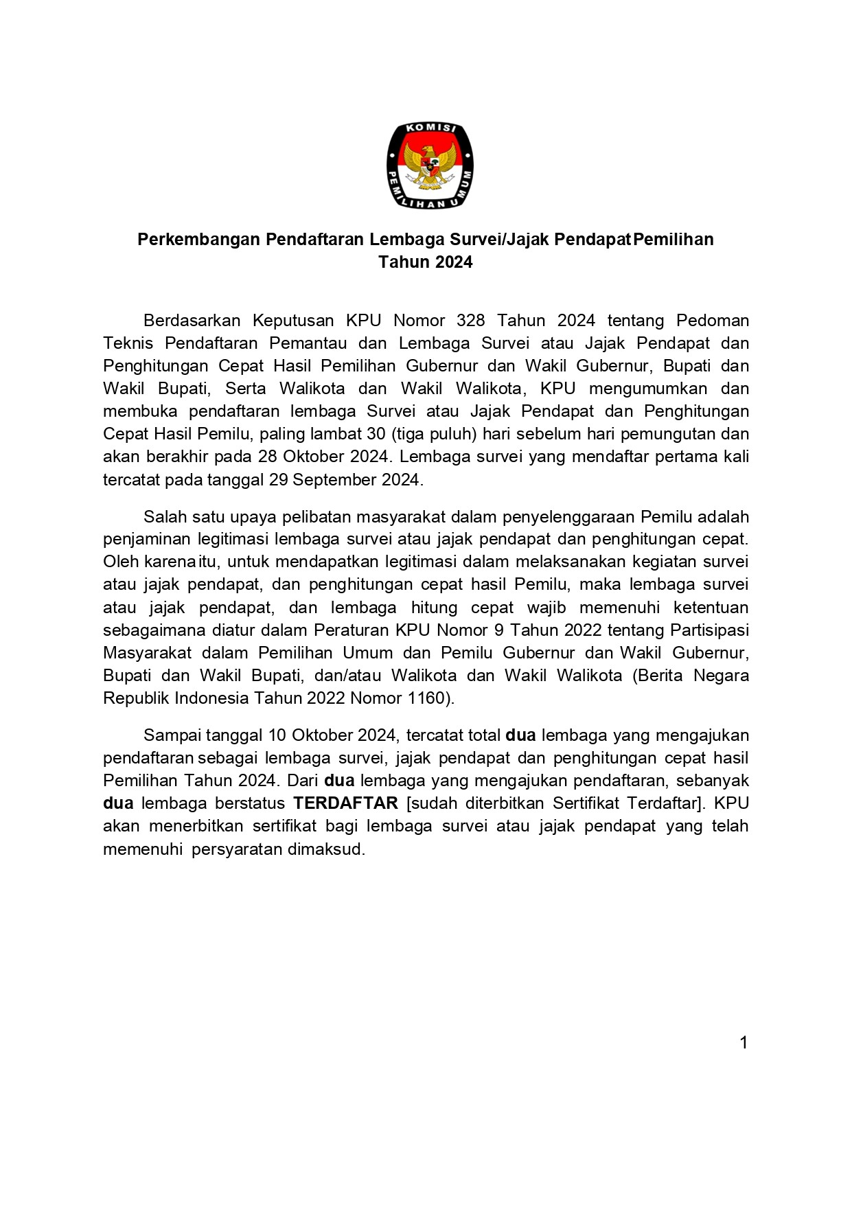 Sampai tanggal 10 Oktober 2024, tercatat total dua lembaga yang mengajukan pendaftaran sebagai lembaga survei, jajak pendapat dan penghitungan cepat hasil Pemilihan Tahun 2024. Dari dua lembaga yang mengajukan pendaftaran, sebanyak dua lembaga berstatus TERDAFTAR [sudah diterbitkan Sertifikat Terdaftar]. KPU akan menerbitkan sertifikat bagi lembaga survei atau jajak pendapat yang telah memenuhi persyaratan dimaksud.