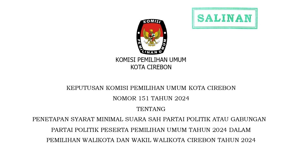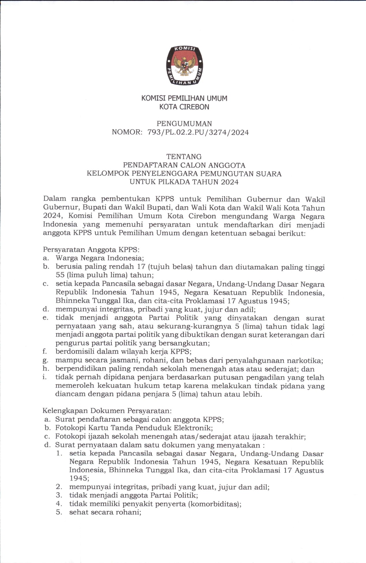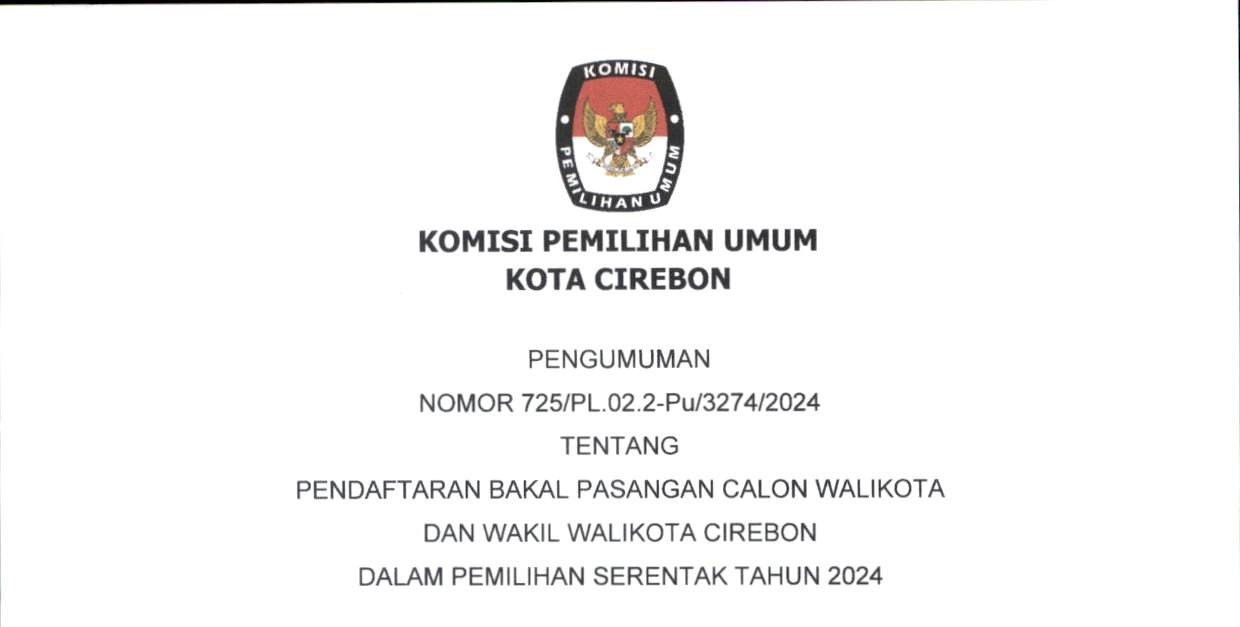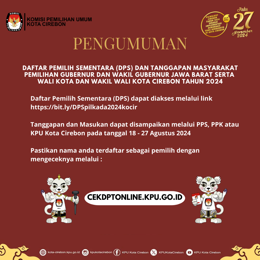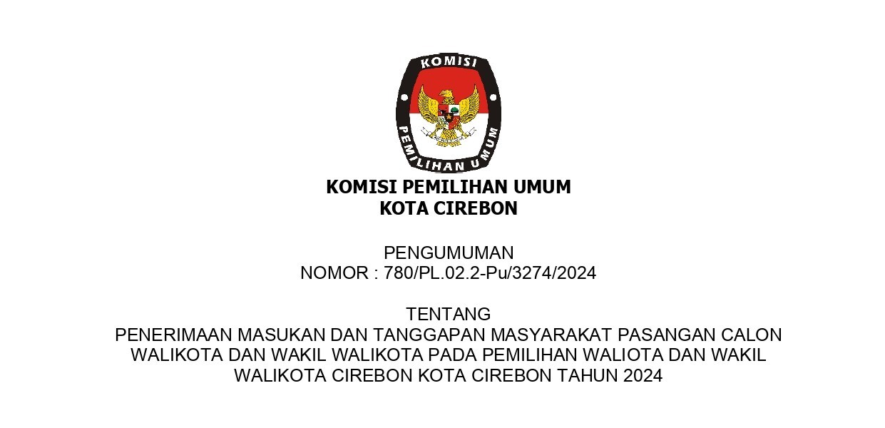Cirebon, kota-cirebon.kpu.go.id - Bahwa untuk melaksanakan ketentuan Pasal 137 Peraturan KPU Nomor 8 Tahun 2024 tentang Pencalonan Gubernur dan Wakil Gubernur, Bupati dan Wakil Bupati, serta Walikota dan Wakil Walikota yang telah diubah dengan Peraturan KPU Nomor 10 Tahun 2024 tentang Perubahan Atas Peraturan KPU Nomor 8 Tahun 2024 tentang Pencalonan Gubernur dan Wakil Gubernur, Bupati dan Wakil Bupati, serta Walikota dan Wakil Walikota, Komisi Pemilihan Umum Kota Cirebon mengumumkan Penerimaan Masukan dan Tanggapan Masyarakat terhadap Pasangan Calon Walikota dan Wakil Walikota Kota Cirebon pada tautan sebagai berikut: Pengumuman, Visi, Misi, dan Program Masyarakat dapat memberikan masukan dan tanggapan atas calon dan/atau Pasangan Calon Walikota dan Wakil Walikota Kota Cirebon pada Pemilihan Walikota dan Wakil Walikota Kota Cirebon Tahun 2024 melalui: 1. Portal Publikasi Pemilu dan Pemilihan pada laman: https://infopemilu.kpu.go.id dalam fitur “tanggapan” dengan cara: a. memilih tahapan “Pencalonan Peserta Pemilihan Kepala Daerah” b. memilih kategori “Tanggapan terhadap Pasangan Calon Pemilihan Kepala Daerah” c. memilih calon yang akan diberikan masukan dan tanggapan d. mengisi data identitas pemberi masukan dan tanggapan masyarakat e. mengisi jenis masukan dan tanggapan berupa: 1) dukungan atas calon dan/atau pasangan calon, 2) masukan dan tanggapan masyarakat terkait: pasangan calon, status sebagai mantan terpidana dan terpidana termasuk jenis tindak pidananya, dan/atau hasil penelitian persyaratan administrasi calon/penelitian perbaikan persyaratan administrasi calon. f. menuliskan uraian. g. mengunggah dokumen yaitu: KTP-el dan/atau dokumen bukti penunjang yang relevan. h. menekan “SUBMIT” 2. secara luring ke Kantor KPU Kota Cirebon dengan alamat Jl. Dr. Wahidin No. 6, Kel. Sukapura, Kec. Kejaksan, penyampaian masukan dan tanggapan masyarakat secara luring dilakukan dengan cara: a. mengisi daftar hadir. b. mengisi formulir Model TANGGAPAN. MASYARAKAT.KWK. c. menyerah formulir sebagaimana dimaksud huruf b kepada KPU Kota Cirebon d. menyerahkan fotokopi KTP-el dan/atau dokumen bukti penunjang yang relevan. Dalam rangka mewujudkan keterbukaan informasi dan mendorong partisipasi masyarakat pada pemilihan Walikota dan Wakil Walikota Kota Cirebon Tahun 2024, KPU Kota Cirebon mengumumkan visi, misi dan program pasangan calon sabagaimana terlampir. Masukan dan Tanggapan Masyarakat terhadap calon dan/atau Pasangan Calon Walikota dan Wakil Walikota Kota Cirebon Pada Pemilihan Walikota dan Wakil Walikota Kota Cirebon Tahun 2024 diterima oleh KPU Kota Cirebon pada tanggal 15 - 18 September 2024. Demikian diumumkan untuk diketahui.